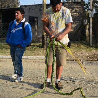 “La piedra en el cauce” además de haberse tratado de este tipo de experiencia posee una naturaleza relacional pues como afirma Nicolas Bourriaud en “Estética relacional”, a partir de los años 90 se han producido obras que “ya no tienen como meta formar realidades imaginarias o utópicas, sino constituir modos de existencia o modelos de acción dentro de lo real ya existente” (2008 p. 12) las cuales se consideraron precursoras de la denominada estética relacional por los lazos que en ellas se crearon entre el o la artista y la comunidad. En el caso de “La piedra en el cauce” lo real ya existente fue la comunidad donde se establecieron lazos (o relaciones) por medio del encuentro-taller de tejido comunitario. El mismo consistió en una jornada de intercambio de saberes prácticos entre las artistas y las vecinas que asistieron al taller donde se transfirió la práctica de tejido con diferentes técnicas, de fibras naturales (de palma, ñocha y chala entre otras) y de material plástico reutilizado (hilo PET y fleje) cedido por el CIAT (Centro de Interpretación Ambiental y Tecnológica) de Tafí Viejo durante una cálida tarde de invierno.